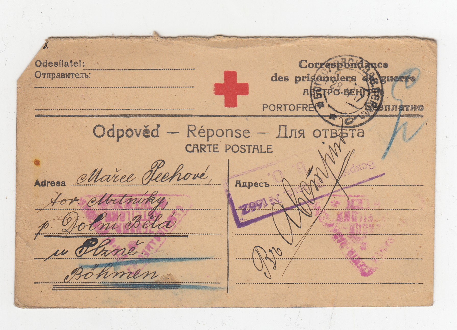 , Popsaná a prošlá poštou (bez známky), lehce odřené růžky, mírně zašpiněná