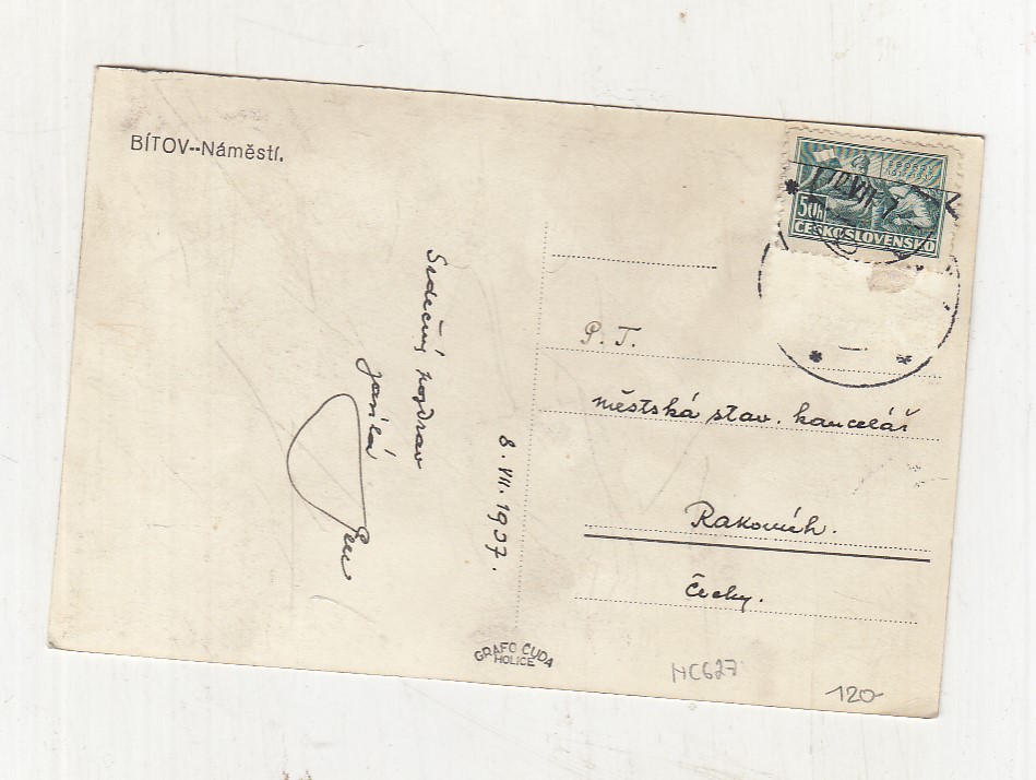 Prošla poštou, popsaná, se známkou, lehce odřené růžky.