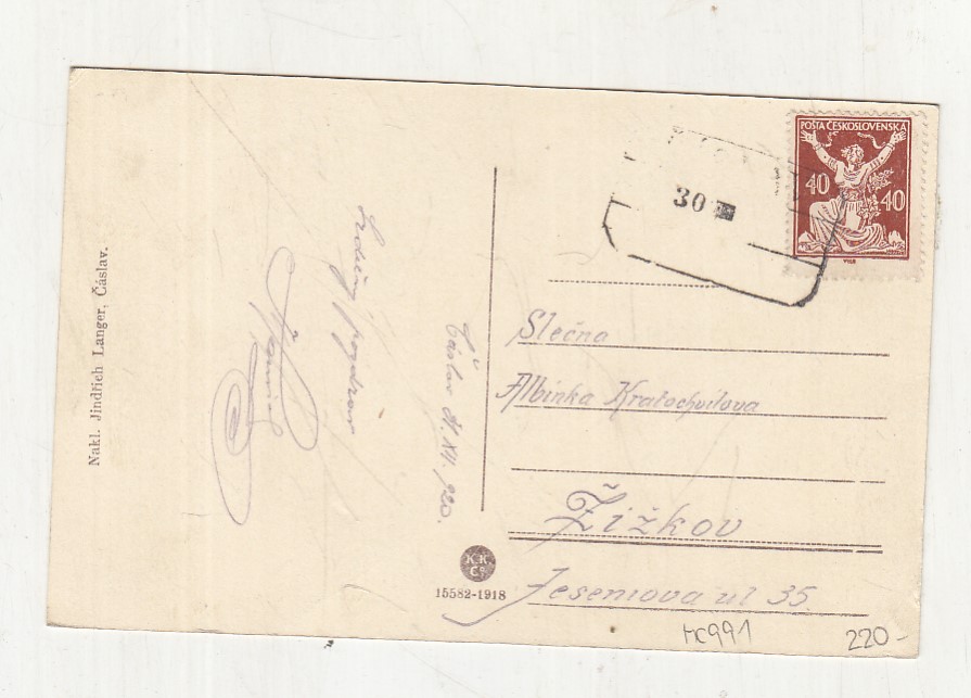 Prošla poštou, popsaná, se známkou, mírně odřené růžky.