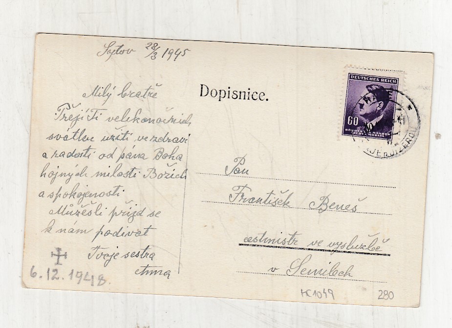 Prošla poštou, popsaná, se známkou, lehce odřené růžky.