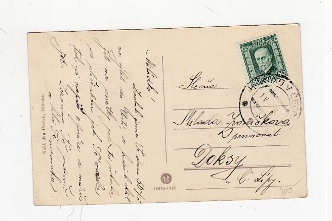 , Prošla poštou, popsaná, se známkou, odřené růžky.