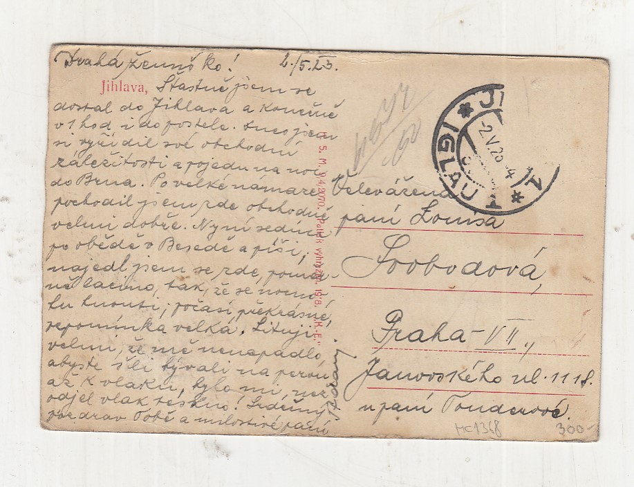 Prošla poštou, popsaná, se známkou, mírně odřené růžky.