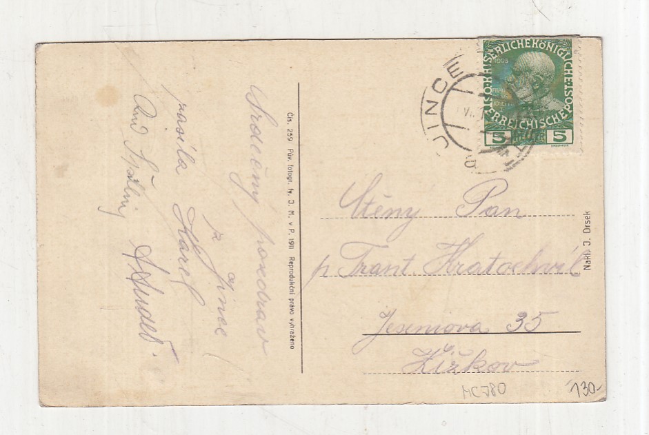 Prošla poštou, popsaná, se známkou, lehce odřené růžky.