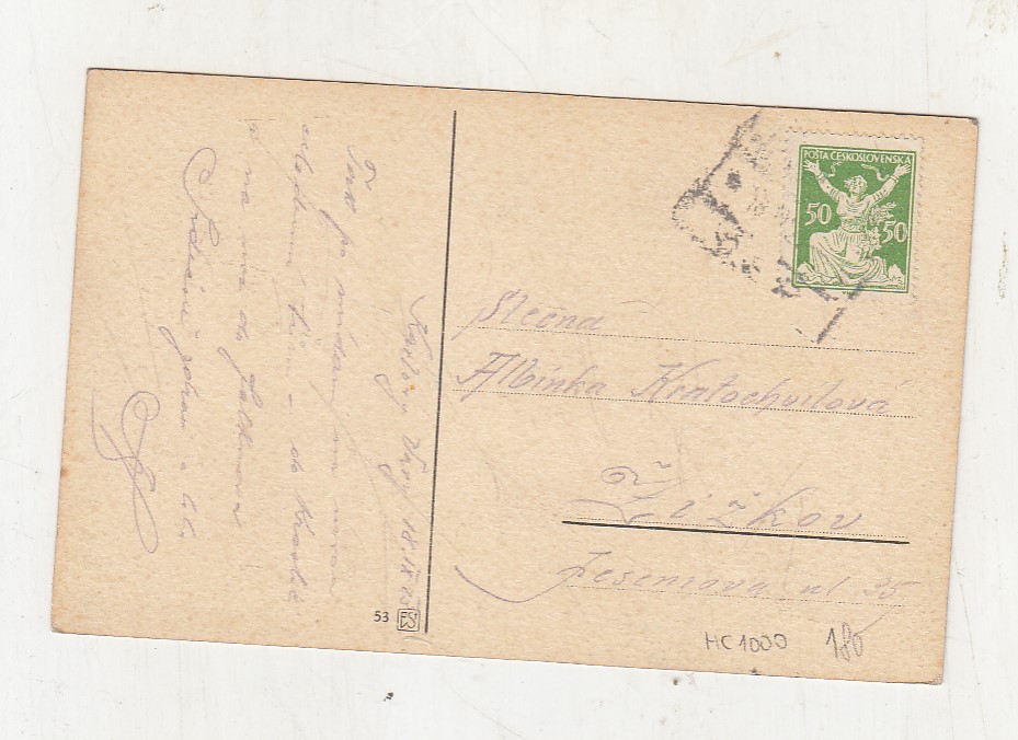 Prošla poštou, popsaná, se známkou, mírně odřené růžky.