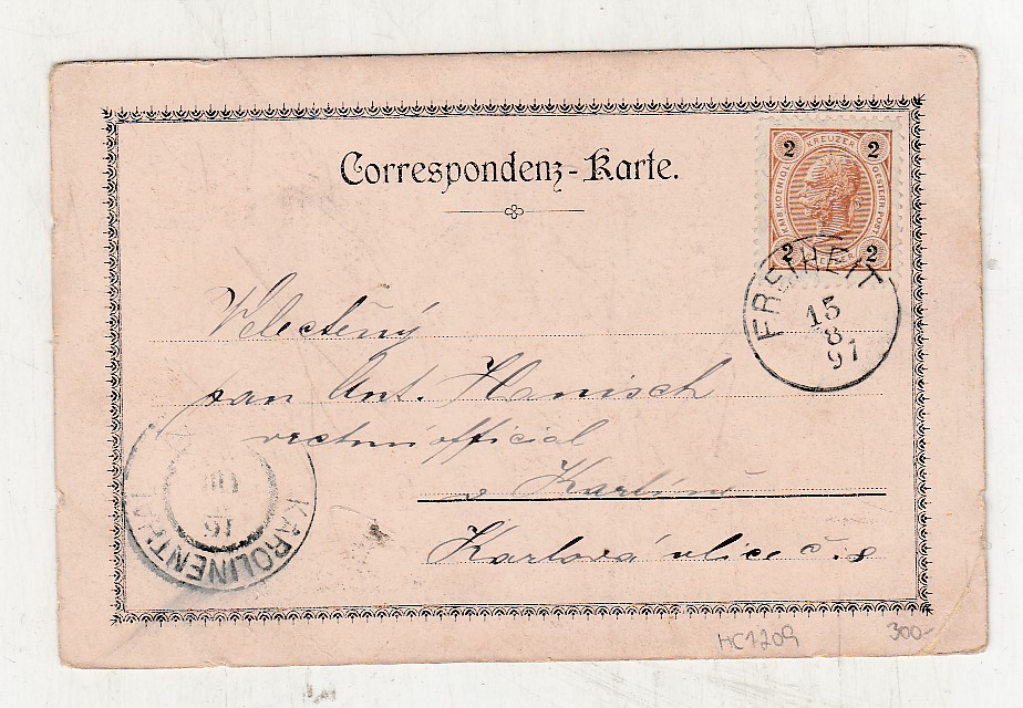Prošla poštou, popsaná, se známkou, mírně odřené růžky.