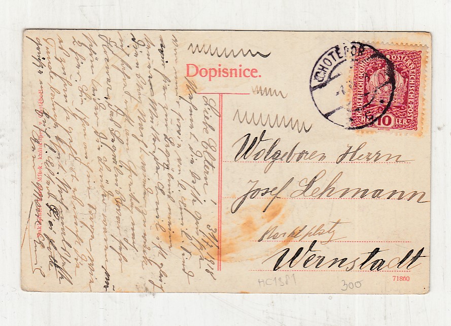 Prošla poštou, popsaná, se známkou, mírně odřené růžky.