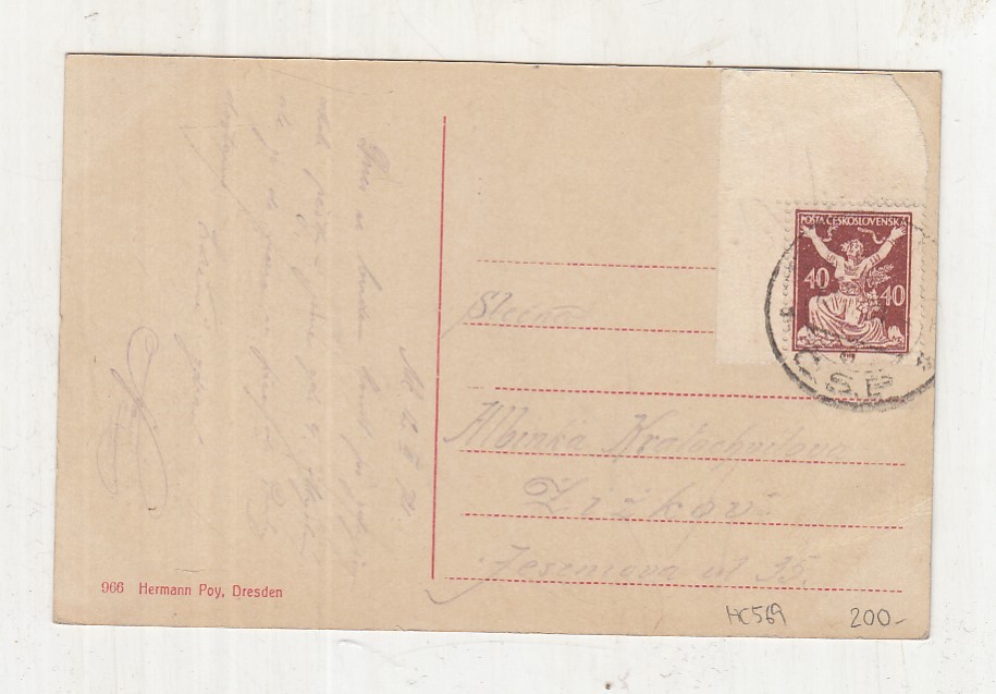Prošla poštou, popsaná, se známkou, mírně odřené růžky.
