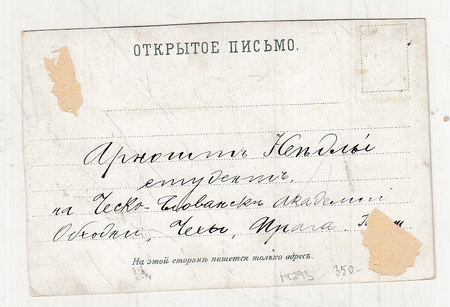 Neprošla poštou, popsaná, bez známky, lehce odřené růžky.