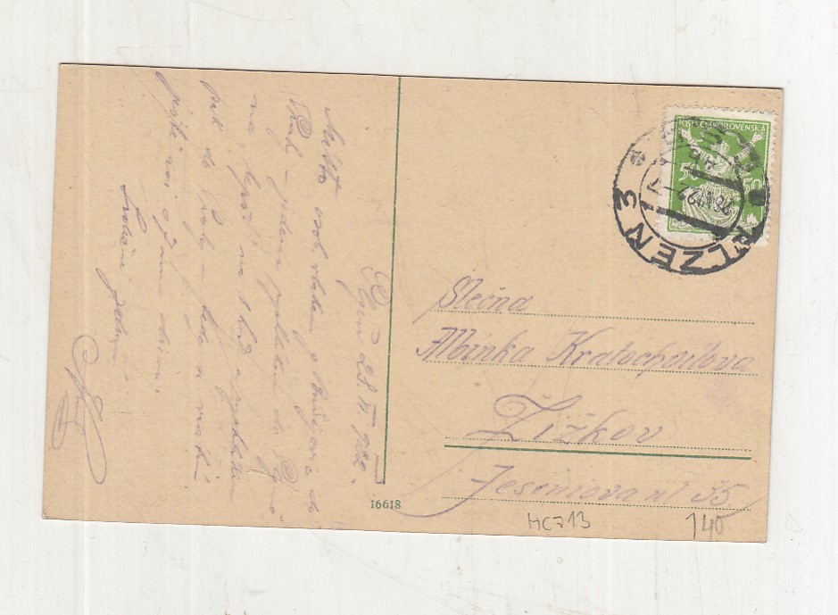 Prošla poštou, popsaná, se známkou, lehce odřené růžky.