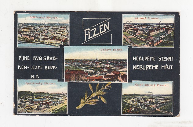 Plzeň (Měšťanský pivovar, Akciový pivovar, Společenský pivovar, Český akciový pivovar) - Pijme pivo s bobkem - jezme bedrnik, nebudeme stonat, nebudeme mřit