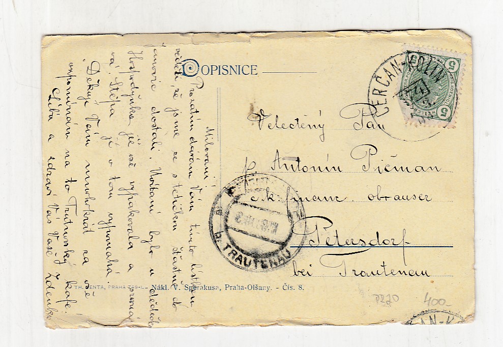 prošla poštou, popsaná, se známkou, růžky mírně odřené