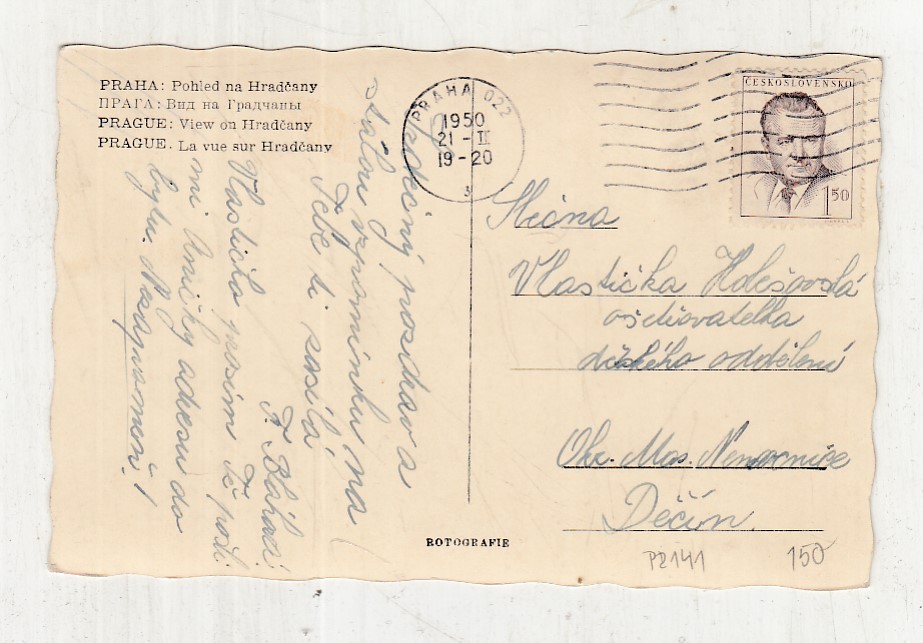 Prošla poštou, popsaná, se známkou, mírně odřené růžky.