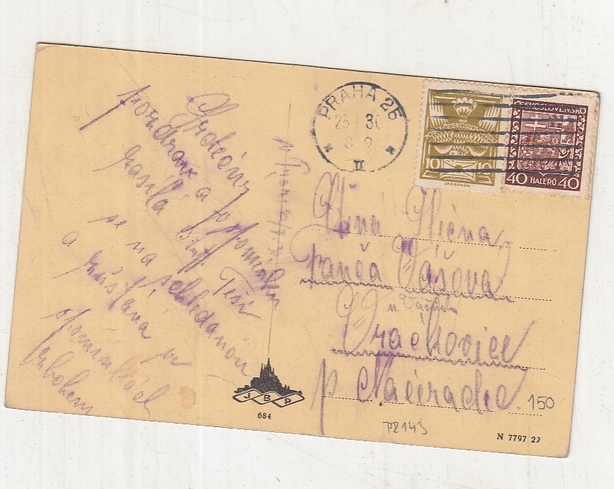 Prošla poštou, popsaná, se známkou, mírně odřené růžky.