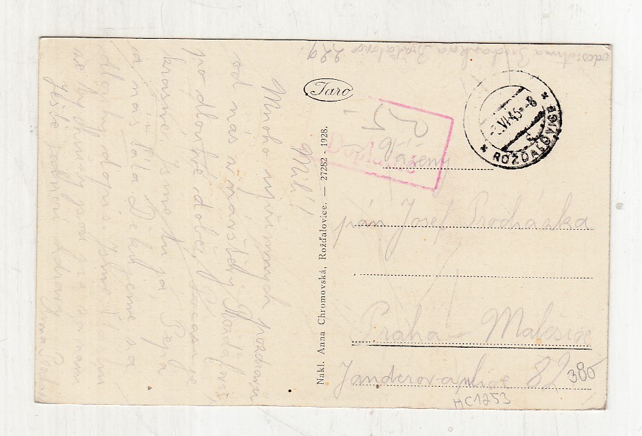 Prošla poštou, popsaná, bez známky, lehce odřené růžky.