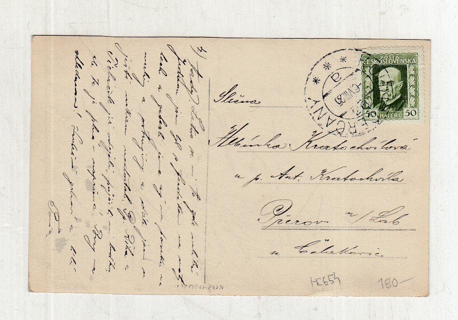Prošla poštou, popsaná, se známkou, lehce odřené růžky.