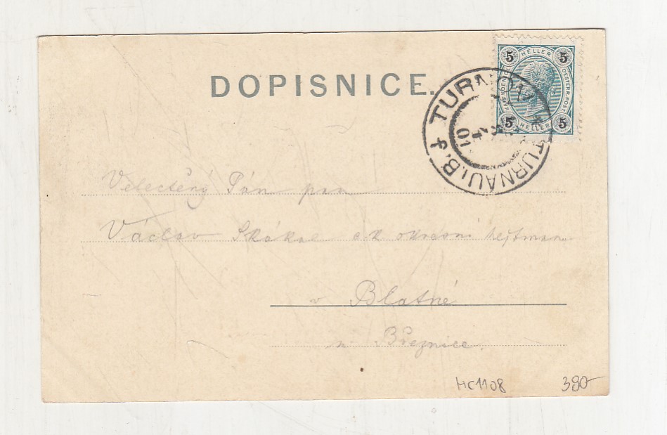 Prošla poštou, popsaná, se známkou, mírně odřené růžky.
