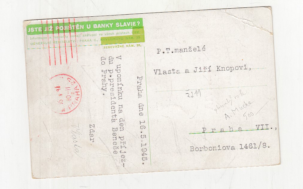 prošla poštou, popsaná, bez známky, růžky mírně odřené