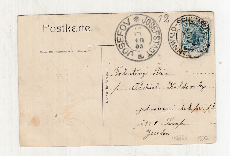 Prošla poštou, popsaná, se známkou, lehce odřené růžky.