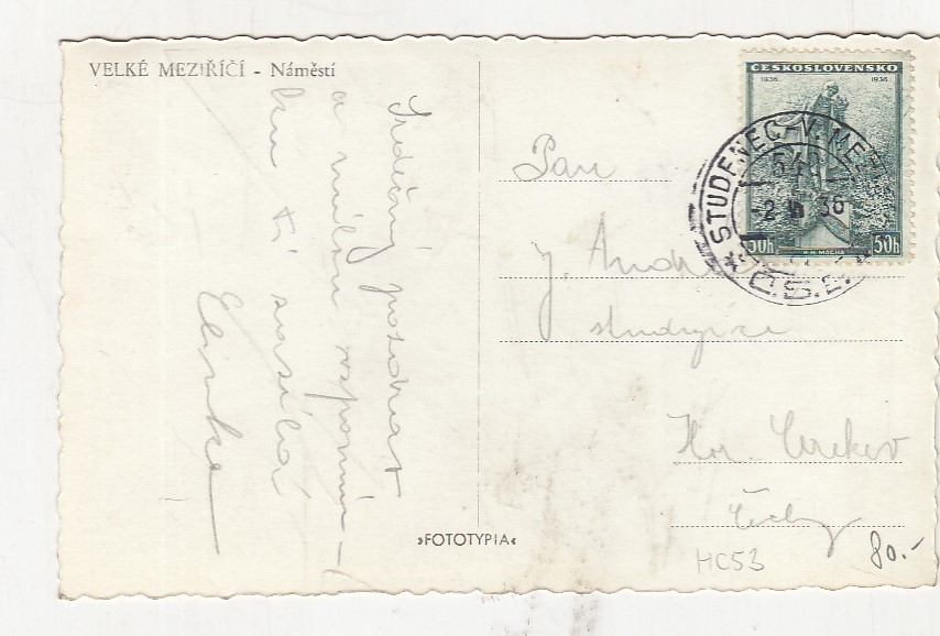 prošla poštou, popsaná, se známkou, lehce odřené růžky