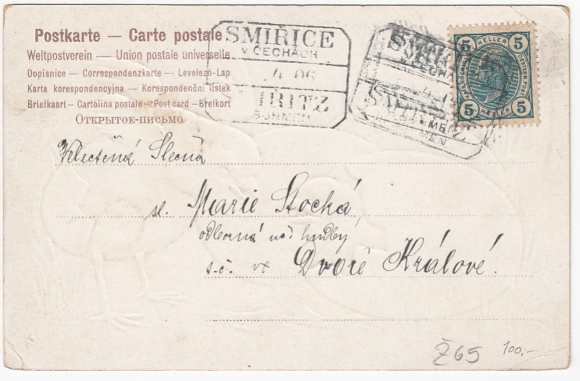 , prošlá poštou, mírně zašpiněná, mírně opotřebené růžky