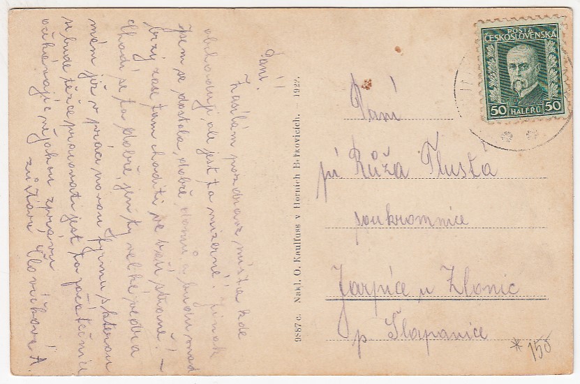 Popsaná a prošlá poštou, lehce opotřebené růžky, lehce zašpiněná